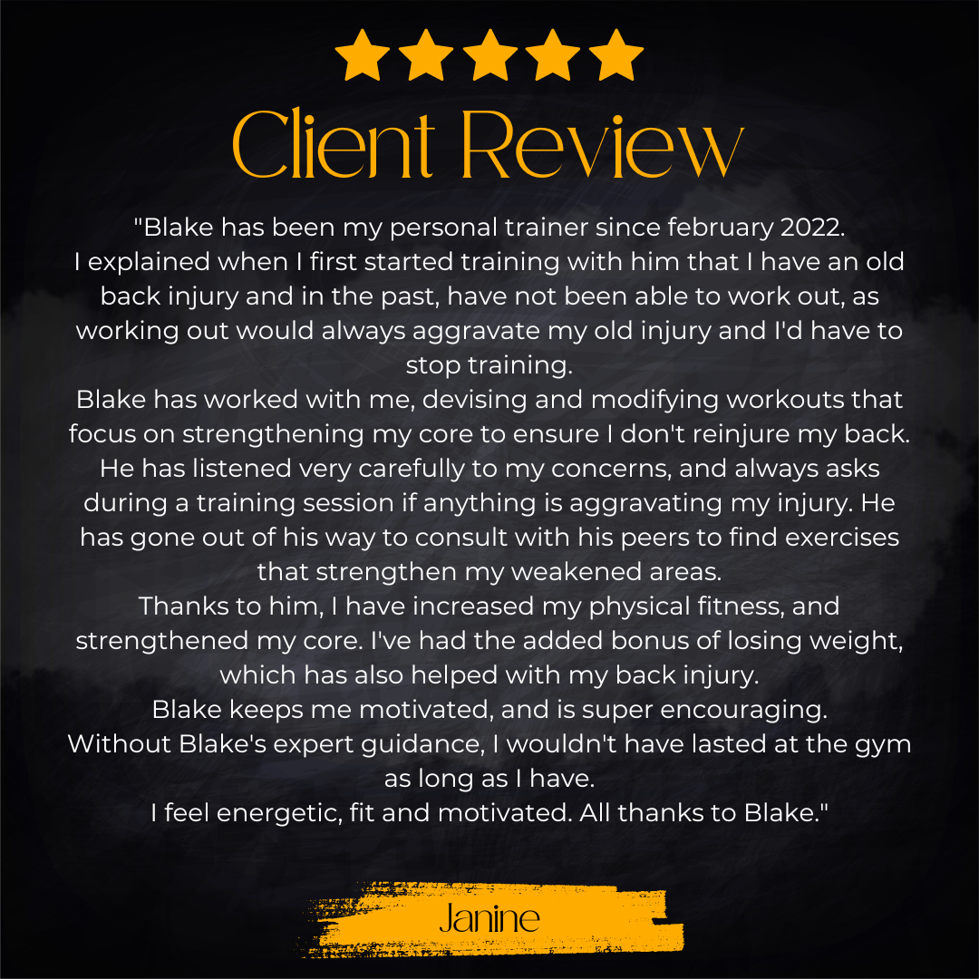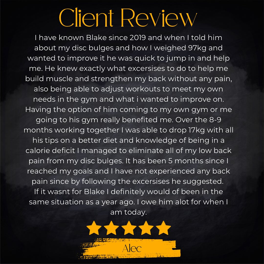 If face to face training is more your thing, and you live in and around Clyde Nth, Blake would love to help you get to your goals.
